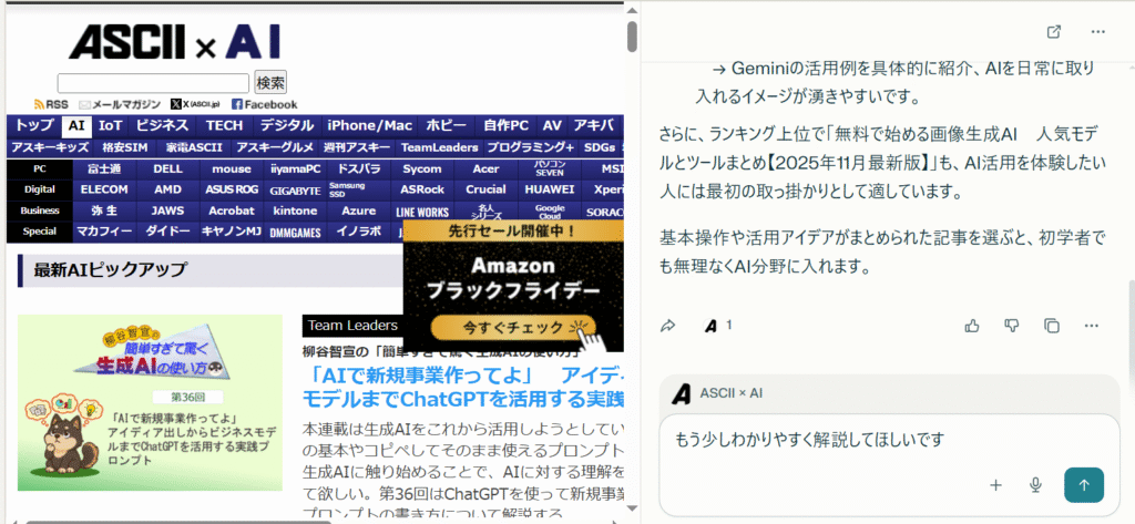 普通なら「ページを見て、タブを切り替えて、AIに質問して…」ってあちこち移動しないといけないですよね。