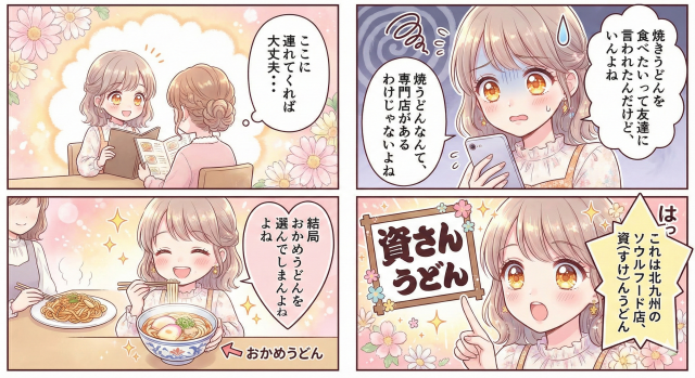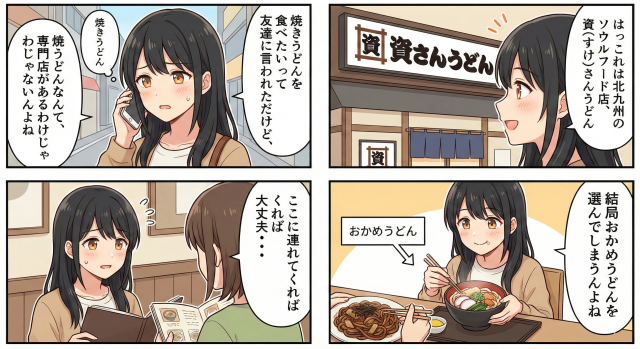 みお(AI):「それなら、『資さんうどん』ネタはどうですか? 友達に『焼きうどん食べたい』って言われて連れて行ったのに、結局自分がいつものメニューを頼んじゃう…みたいな!😆」