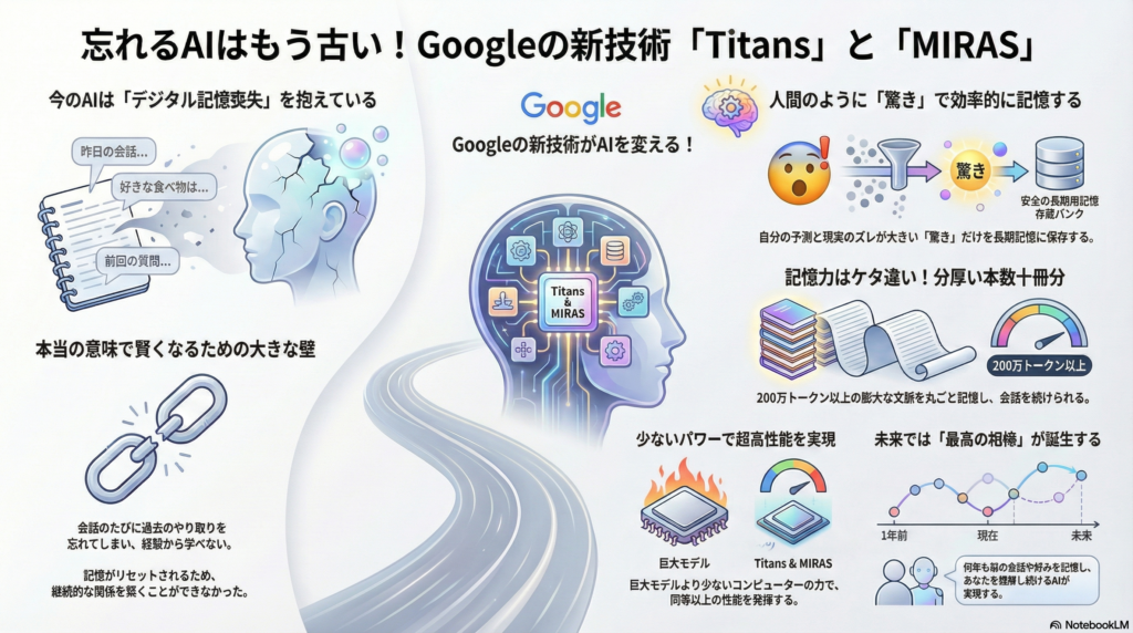 今日のニュースは、AI界隈で「歴史が変わるかも!?」と話題沸騰中の、Googleによる「Titans(タイタンズ)」と「MIRAS(ミラス)」という新技術についてです!簡単に言うと、「会話をすぐに忘れちゃう、ちょっとおっちょこちょいなAI」の時代が終わるかもしれない、という内容なんですよ!