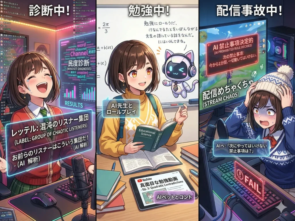 - AIに配信のルールを決めさせる: ゲーム実況中にAIへ「次にやってはいけない禁止事項は?」と聞いて、配信をめちゃくちゃにされる配信者さん。